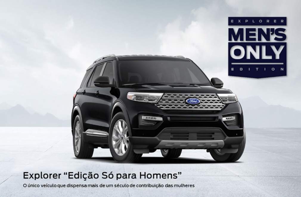 A Ford apresentou nos Estados Unidos uma nova versão do Explorer, a “Edição Só para Homens” do SUV. No vídeo de lançamento – veja aqui –, o locutor explica que se trata de um veículo reimaginado, sem nenhum recurso desenvolvido originalmente por mulheres, como aquecedores, limpadores de para-brisa, luzes de pisca e de freio e GPS.