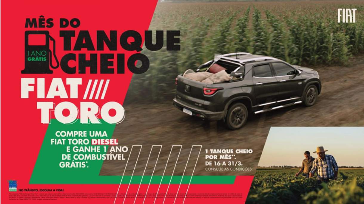 Intitulada de “Mês do Tanque Cheio Fiat”, a campanha permite que os novos proprietários de uma Toro Diesel tenham direito a 60 litros de Diesel por mês, durante 12 meses. O crédito será feito através do aplicativo Cart (www.fiat.com.br/cart.html), plataforma de e-commerce do grupo Stellantis.