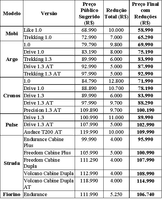 Confira abaixo os novos preços praticados com as reduções que agregam além do incentivo oferecido pelo Governo Federal, bônus oferecidos pela montadora e pela rede de concessionárias Fiat: