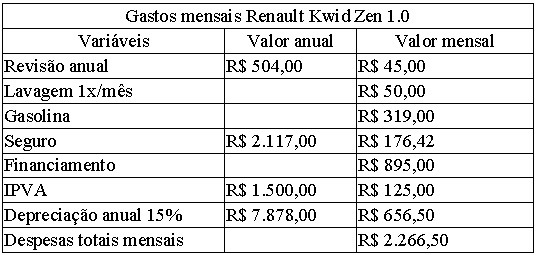 - A locação do Renault Kwid pelo app V1, com proteção para terceiros, está custando R$ 191,48 (valor sujeito a alteração), com retirada na sexta-feira e devolução no domingo. Calculando a necessidade do automóvel durante todos os quatro fins de semana de um mês e somando isso ao valor-base da gasolina de R$ 319,00, o cliente V1 gastaria R$ 1.083,00 para locar o automóvel aos fins de semana, seja para lazer ou eventuais necessidades. Isso representa uma economia de R$ 1.183,50, o que equivale a 52,2% de economia em comparação com as despesas de manter um carro próprio.