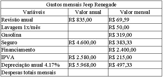 - O cenário de economia se repete no caso do Jeep Renegade. O valor da locação deste modelo por um fim de semana é R$ 429,00 (valor sujeito a alteração). “Ao multiplicarmos esse valor pelos quatro fins de semana do mês e somarmos o valor-base da gasolina, a despesa mensal do locatário será de R$ 2.035,00. Isso resulta em uma economia de 1.899,25 ou 48,3%”, explica a professora.