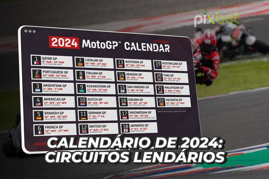 O ano de 2024 nos encantará com um novo evento de MotoGP, que será uma ótima oportunidade para suas apostas. O torneio começou em 1º de fevereiro e se estenderá até novembro, com a última corrida ocorrendo de 15 a 17 de novembro. A cada mês as pistas mudarão, por exemplo, em março teremos corridas no Circuito Internacional de Lusail e no Autódromo Internacional do Algarve, e em abril serão realizadas no Circuit Of The Americas e no Circuito de Jerez - Ángel Nieto. Cada um dos circuitos tem curvas desafiadoras e apertadas que determinarão a posição dos pilotos na classificação final.