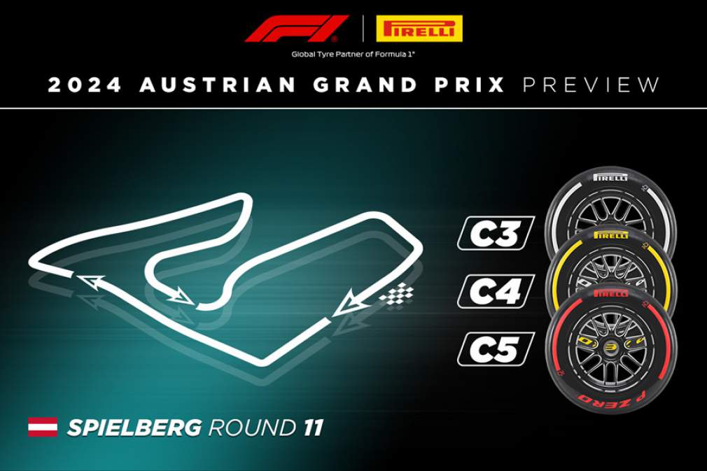 Como habitual neste evento, a Pirelli escolheu os três compostos mais macios da gama de 2024, o C3 como Duro, o C4 como Médio e o C5 como Macio. A superfície da pista de Spielberg é um tanto antiga e, portanto, altamente abrasiva, mas as forças laterais exercidas sobre os pneus são definitivamente abaixo da média da temporada, resultando num desgaste geral muito limitado. A tração nas curvas lentas e a estabilidade nas frenagens são fatores-chave para ser competitivo nesta pista. É importante administrar os pneus para evitar o superaquecimento, principalmente se rodarem em altas velocidades: os pilotos que não conseguirem mantê-los suficientemente frios podem ter dificuldade em se defender dos ataques de outros carros, especialmente no primeiro e no último setores. Portanto, outro fator importante será a temperatura ambiente num local onde o clima é frequentemente bastante variável. Nas duas últimas edições desta corrida, a estratégia de duas paradas se provou a mais rápida com pneus médios e duros e, no ano passado, nenhum piloto apostou nos macios.