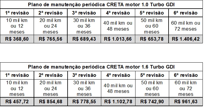 A nova geração do Creta tem cinco anos de garantia sem limite de quilometragem para veículos de uso particular. Nas aplicações comerciais, a garantia continua de cinco anos ou até atingir 100 mil quilômetros. O SUV chega com revisões periódicas até 60 mil quilômetros com preços fixos para ambas as motorizações. No caso das versões 1.0 turbo GDI, o valor total fica abaixo dos R$ 5 mil, extremamente competitivo (R$ 4.897). Para a nova motorização 1.6 turbo GDI, o valor total também fica abaixo dos R$ 5 mil (R$ 4.898), sendo um dos mais baratos frente os concorrentes diretos. Confira abaixo os valores das seis primeiras seis revisões:
