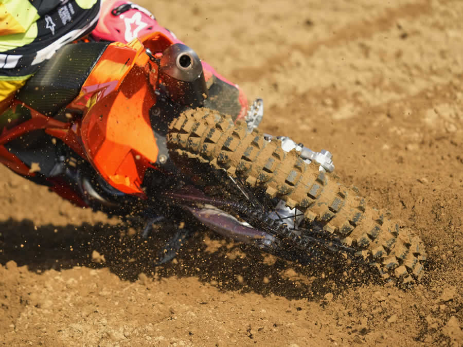 · Maior tração no holeshot e fora das curvas: O formato dos cravos laterais do pneu traseiro melhora a rigidez de torção para trajetórias precisas, enquanto a disposição lateral dos cravos aumenta a tração nas curvas. A interação entre os cravos centrais e laterais melhora a tração durante a aceleração e o impulso lateral nas curvas. O padrão inovador da banda de rodagem do pneu dianteiro maximiza a tração e a aderência lateral graças à seção entre os dois blocos centrais.