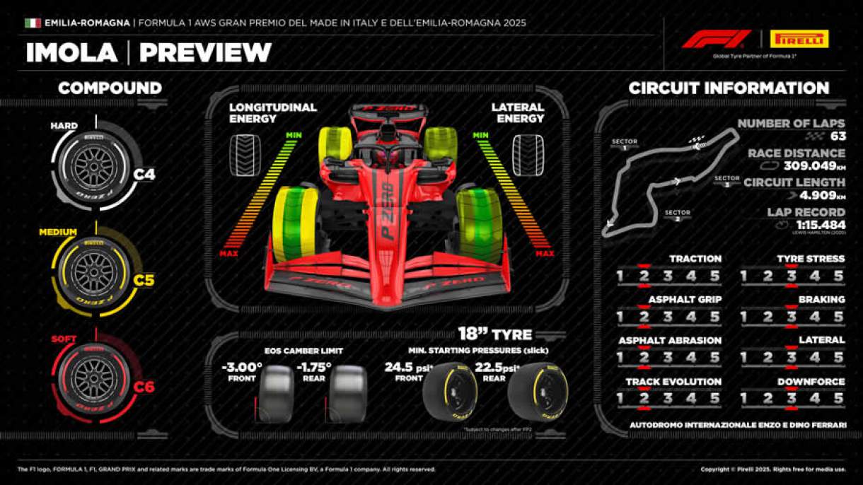 O novo composto C6 fará sua estreia de corrida em Ímola, já que a Pirelli escolheu o trio de compostos mais macios de sua gama de 2025 para este fim de semana, com o C4 como Duro, o C5 como Médio e o C6 como Macio. Será a primeira vez que os pilotos utilizarão o C6 nos carros desta temporada, já que nenhum deles o utilizou no teste do Bahrein.