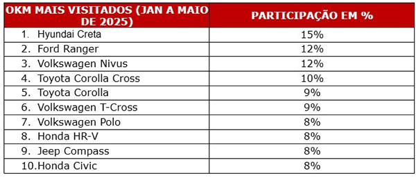 Entre os modelos 0KM que mais receberam visitas nos cinco primeiros meses de 2025, destaque para o Hyundai Creta, com 15% de participação entre os 10 mais visitados. Na sequência, estão Ford Ranger (12%), Volkswagen Nivus (12%), Toyota Corolla Cross (10%), Toyota Corolla (9%), Volkswagen T-Cross (9%), Volkswagen Polo (8%), Honda HR-V (8%), Jeep Compass (8%) e Honda Civic (8%).