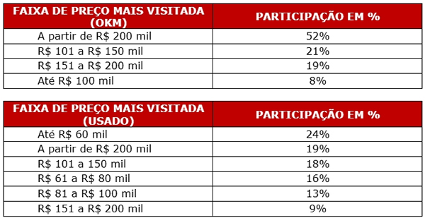No mercado de usados, o interesse maior no período foi pelos modelos até R$ 60 mil, com 24% do total de visitas. Na sequência, estão as faixas a partir de R$ 200 mil (19%); entre R$ 101 e R$ 150 mil (18%); entre R$ 61 e R$ 80 mil (16%); entre R$ 81 e R$ 100 mil (13%); e entre R$ 151 e 200 mil (9%).