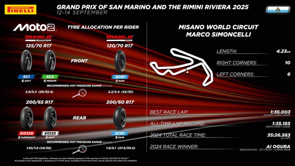 “No ano passado, Misano recebeu dois GPs consecutivos e, em ambos os casos, os pilotos da Moto2 utilizaram o pneu traseiro na especificação D0640, que mais tarde se tornaria o atual SC0 macio padrão. Este ano, porém, eles terão duas alternativas que, com base no que se viu até agora, deverão ser ainda mais eficazes: de um lado, o macio E0125 de desenvolvimento, protagonista indiscutível de quase todas as últimas corridas; do outro, uma opção ainda mais macia, ou seja, o SCX de desenvolvimento na especificação E0126, que estreou com sucesso na Áustria e já foi amplamente utilizada pelos pilotos do Mundial de Superbike com ótimos resultados.