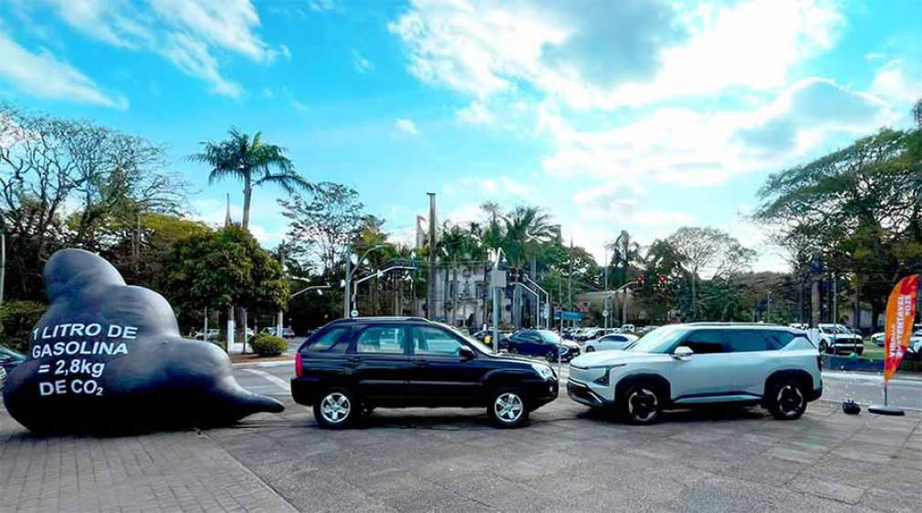O Kia EV5, veículo 100% elétrico, compõe obra de arte que traz reflexões sobre as emissões veiculares e os benefícios de um futuro mais sustentável
