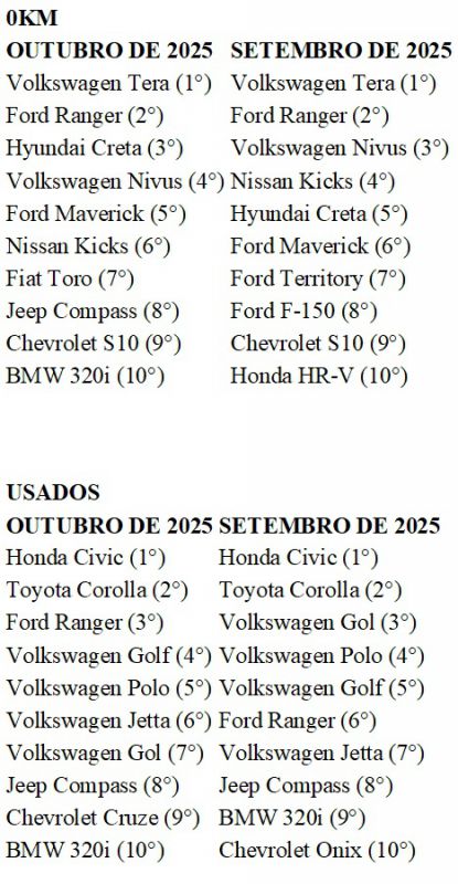 No segmento de usados, o Honda Civic segue como o modelo mais buscado, seguido por Toyota Corolla (2º), Ford Ranger (3º), Volkswagen Golf (4º), Volkswagen Polo (5º), Volkswagen Jetta (6º), Volkswagen Gol (7º), Jeep Compass (8º), Chevrolet Cruze (9º) e BMW 320i (10º).