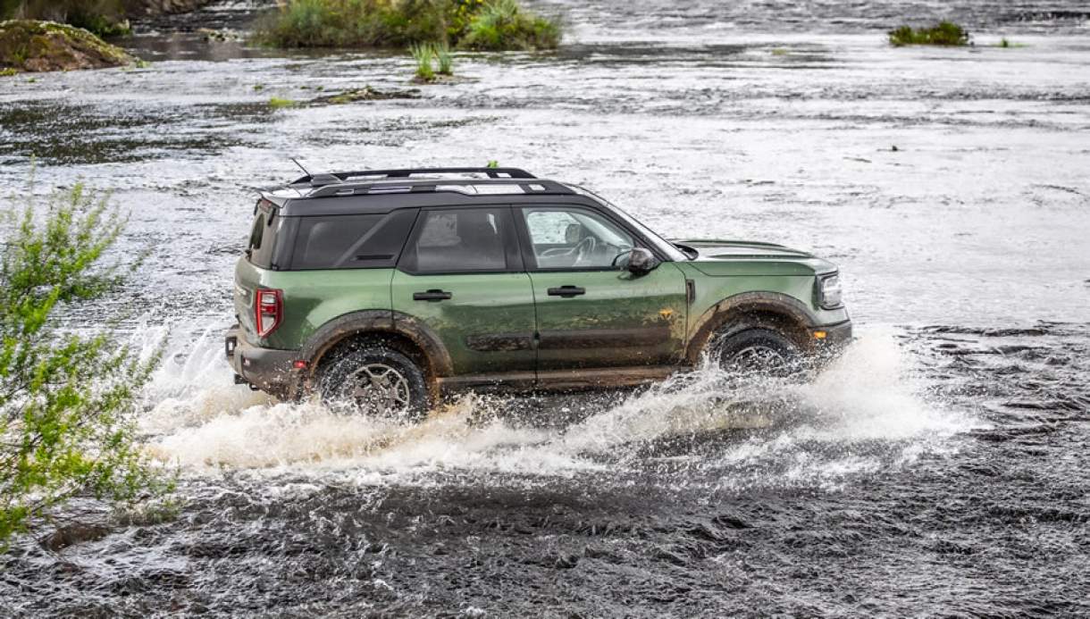 - Só atravesse trechos alagados se a água estiver até a altura do meio da roda. A F-150 e o Bronco Sport, por exemplo, podem rodar em até 60 cm de profundidade de água. Já a Ranger encara até 80 cm de profundidade e a Ranger Raptor, até 85 cm.